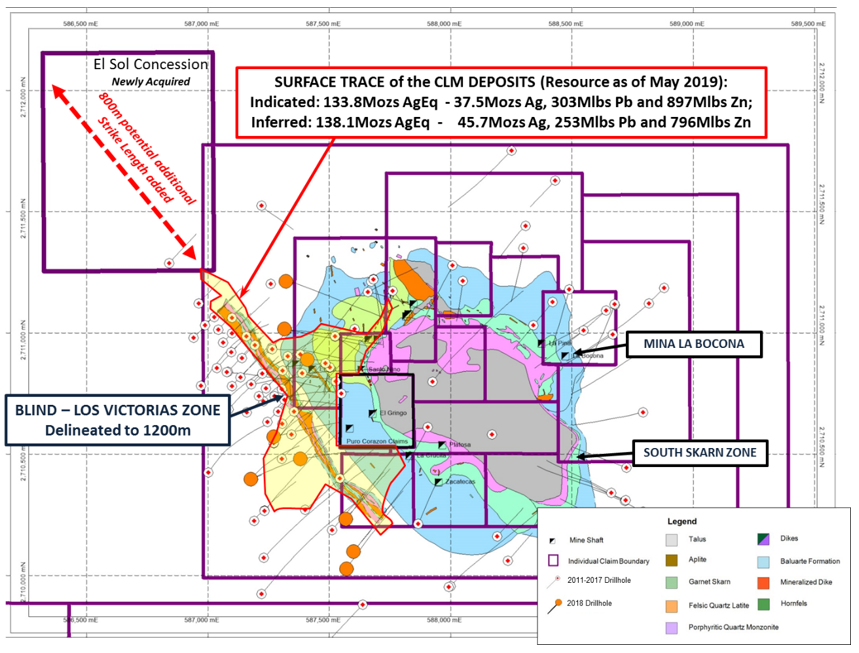 - The 2019 Cerro Las Minitas Resource Estimate was prepared following CIM definitions for classification of Mineral Resources. Resources are constrained using mainly geological constraints and approximate 10g/t AgEq grade shells. The block models are comprised of an array of blocks measuring 10m x 2m x 10m, with grades for Au, Ag, Cu, Pb, Zn values interpolated using ID3 weighting. Silver and zinc equivalent values were subsequently calculated from the interpolated block grades. The model is identified at a 175g/t AgEq cut-off, with an indicated resource of 11,102,000 tonnes averaging 105g/t Ag, 0.10g/t Au, 1.2% Pb, 3.7% Zn and 0.16% Cu and an inferred resource of 12,844,000 tonnes averaging 111g/t Ag, 0.07g/t Au, 0.9% Pb, 2.8% Zn and 0.27% Cu. AgEq cut-off values were calculated using average long-term prices of $16.6/oz. silver, $1,275/oz. gold, $2.75/lb. copper, $1.0/lb. lead and $1.25/lb. zinc. Metal recoveries for the Blind, El Sol and Las Victorias deposits of 91% silver, 25% gold, 92% lead, 82% zinc and 80% copper and for the Skarn Front deposit of 85% silver, 18% gold, 89% lead, 92% zinc and 84% copper were used to define the cut-off grades. Base case cut-off grade assumed $75/tonne operating, smelting and sustaining costs. All prices are stated in $USD. Silver Equivalents were calculated from the interpolated block values using relative recoveries and prices between the component metals and silver to determine a final AgEq value. The same methodology was used to calculate the ZnEq value. Mineral resources are not mineral reserves until they have demonstrated economic viability. Mineral resource estimates do not account for a resource’s mineability, selectivity, mining loss, or dilution. The current Resource Estimate was prepared by Garth Kirkham, P.Geo. of Kirkham Geosciences Ltd. who is the Independent Qualified Person responsible for presentation and review of the Mineral Resource Estimate. All figures are rounded to reflect the relative accuracy of the estimate and therefore numbers may not appear to add precisely.