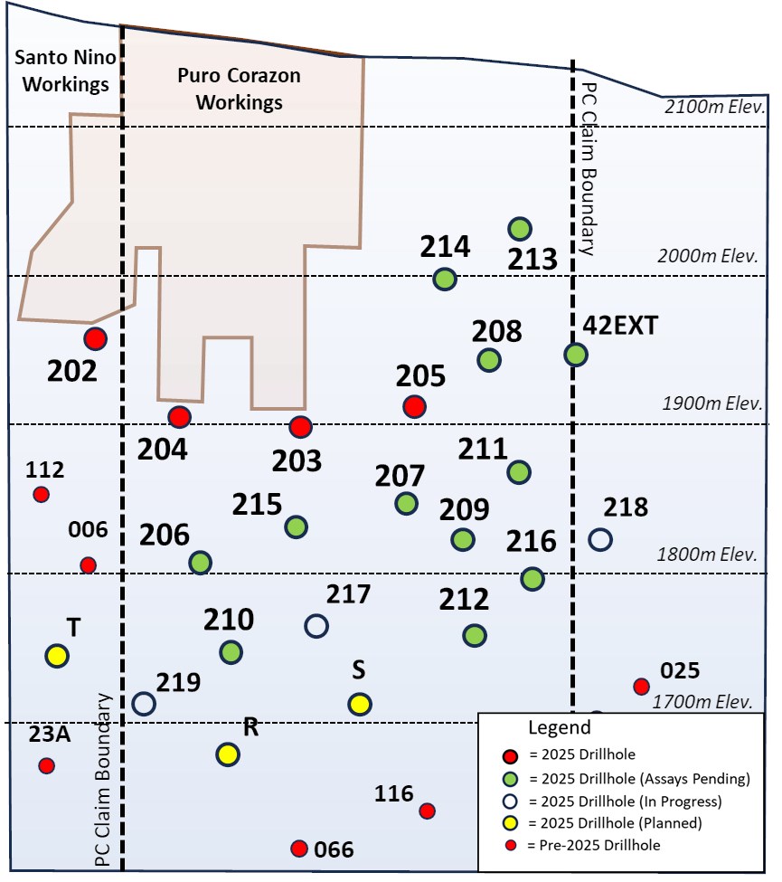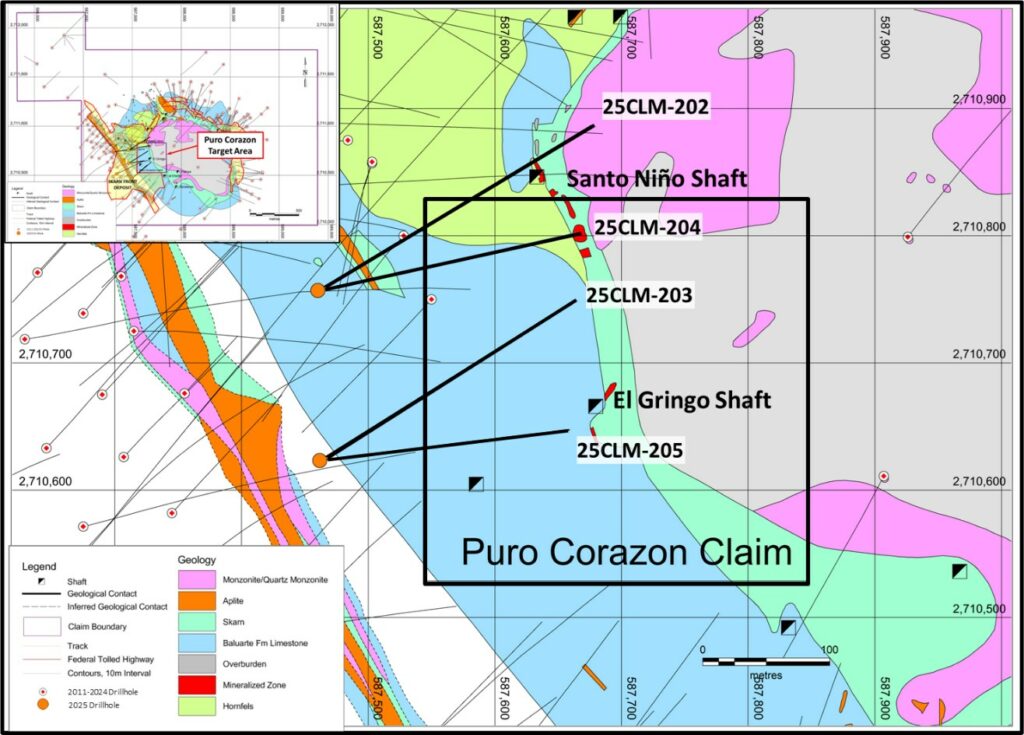 The highlight interval is a 65 metre step-out from previously reported Bonanza-silver mineralization in drill hole 25CLM-203 which returned 10.5 metres averaging 1,115g/t AgEq (see NR-16-26; Dec. 1, 2025). Both mineralized intervals exhibit a similar replacement-style of mineralization, are located on the outer edge of the main skarn zone and may form part of a high-grade hanging wall Carbonate-Replacement (CRD) zone outboard of the historic Puro Corazon workings.