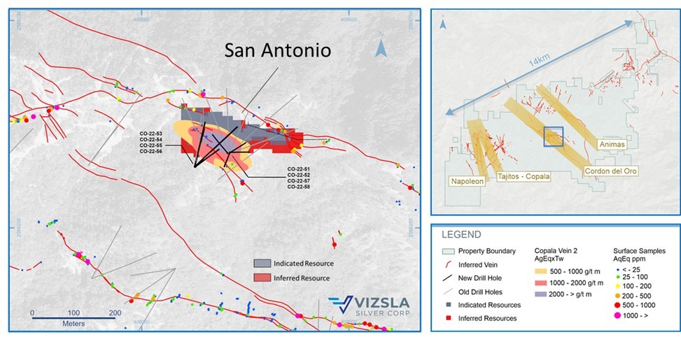 VANCOUVER, BC, July 6, 2022 /CNW/ – Vizsla Silver Corp. (TSXV: VZLA) (NYSE: VZLA) (Frankfurt: 0G3) (“Vizsla” or the “Company“) is pleased to report results from seven new drill holes targeting the San Antonio vein along the Cordon del Oro Vein Corridor, at its 100%-owned, flagship Panuco silver-gold project (“Panuco” or the “Project“) located in Mexico. The results expand mineralization at the San Antonio Vein beyond the boundary of the March 2022 maiden resource estimate by over 100 metres along strike and down dip.Highlights