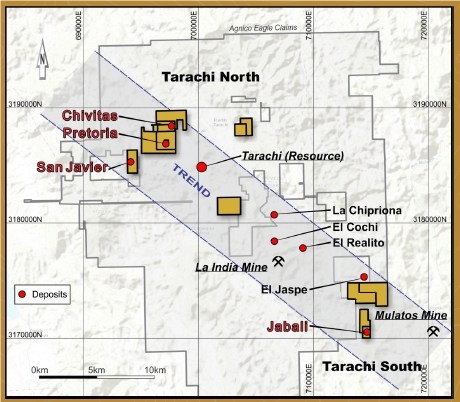 Tarachi’s projects now consist of the San Javier, Pretoria, Chivitas, Jabali, Juliana, Texana and Tarachi concessions for at total of 3,708 ha in the prolific Mulatos gold belt. The Project is approximately 220 kilometers by air east of the City of Hermosillo, and 300 km south of the border between the United States of America and Mexico. The Jabali claim covers the La Dura historic mine and several other small-scale mines. The gold mineralization and geology at Jabali is believed to be similar in character to the gold mineralization at the Mulatos mine. Alamos Gold Inc., in a 2003 annual report, identifies the Jabali project as being part of the “Los Bajios” mineralized trend. The Tarachi project is an early stage exploration project and the mineralization hosted on adjacent and/or nearby properties is not necessarily indicative of mineralization hosted on the Company’s property.