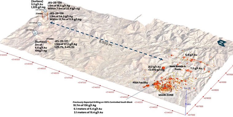 • Three of five drillholes intersected greater than 1 oz/t Ag, across two targets 1.8 km apart. Multiple additional intervals delivering 3-5 m composites grading 15-20+ g/t Ag, with coincident Au, Zn, Pb, and Sb enrichments. Includes 1.5 meters of 54.3 g/t Ag (JES-25-125) and 1.5 meters of 37.2 g/t Ag, 1.2% Pb and 0.4% Zn (JES-25-127).