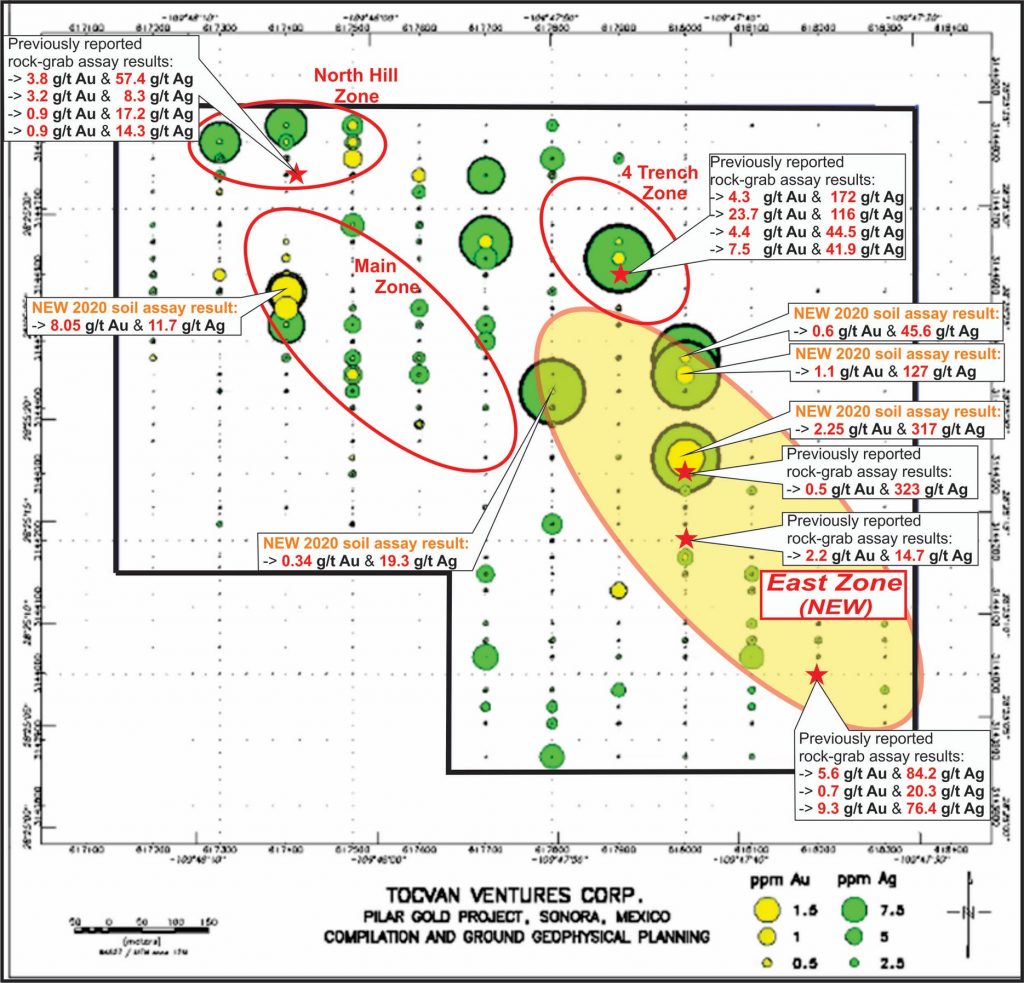 - Results from Property Scale Soil Survey, Included Highest Soil Results to Date with 8 g/t Gold & 317 g/t Silver at New East Zone Discovery