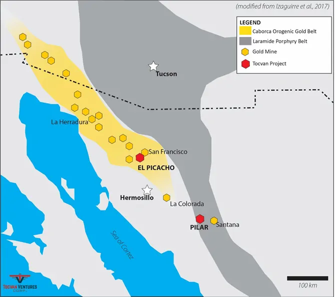 The El Picacho Gold-Silver property is interpreted as an orogenic gold system within the regional Caborca Orogenic Gold Belt known for producing gold mines that include La Herradura (>10 Moz Au) and San Francisco (>3 Moz Au). The project is 140 kilometers north of Hermosillo and only 18 kilometers southwest of the producing San Francisco Mine. The Project totals 24 square kilometers. Five primary zones of mineralization have been identified across the property totalling over six kilometers of prospective trends. Surface sampling and historic workings have identified high-grade gold and silver values. The project has only seen widely spaced reconnaissance drilling with no follow-up. Tocvan believes this provides an excellent opportunity for discovery of a muti-million ounce district.
