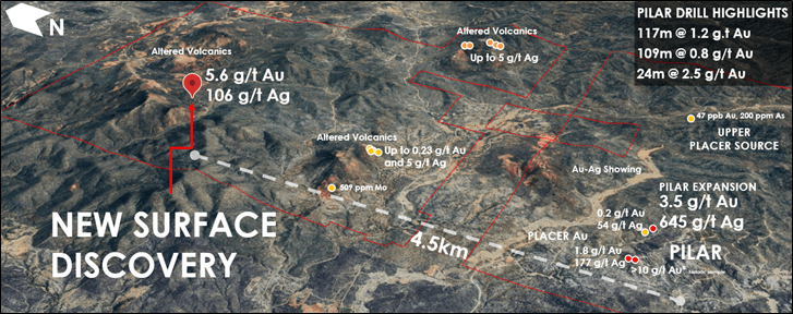 - NEW Surface Discovery, 4.5-km from Pilar – 5.6 g/t Au and 106 g/t Ag
