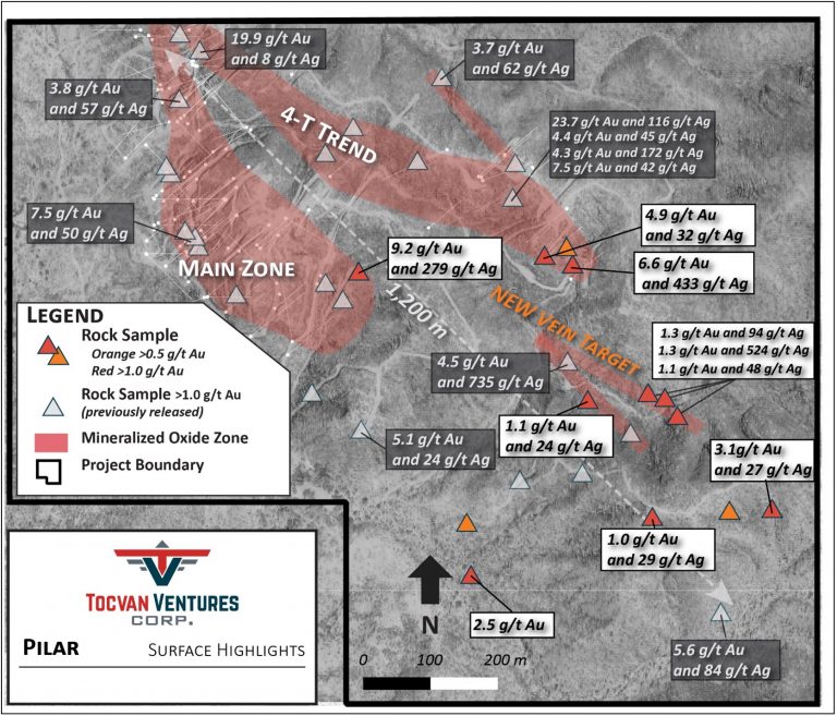 Calgary, Alberta – February 1, 2022 Tocvan Ventures Corp. (the “Company”) (CSE: TOC; OTCQB: TCVNF; FSE: TV3), is pleased to announce surface sample results from its Pilar Au-Ag Project in Sonora, Mexico. A surface exploration program was conducted in December following-up on target areas identified earlier in 2021. A total of 59 samples were collected with 21 samples returning values greater than 0.5 g/t Au (Table 1). Sampling defined several new target areas yet to be drilled. The Main Zone has been expanded with high-grade Au-Ag values (9.2 g/t Au and 279 g/t Ag) along the southeast extent hosted in a silicified quartz vein breccia. The 4-T Trend has been extended to the southeast 100-meters with high-grade Au-Ag values, highlighted by 6.6 g/t Au and 433 g/t Ag hosted in a strongly silicified fault. A new vein corridor identified by several artisanal workings and shafts over a 200-meter strikehas returned high-grade silver values highlighted by 524 g/t Ag and 1.3 g/t Au hosted in a silicified quartz vein breccia. In addition, mineralization has been identified further to the south (300-meters) highlighted by 3.1 g/t Au and 27 g/t Ag.