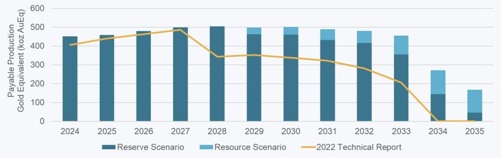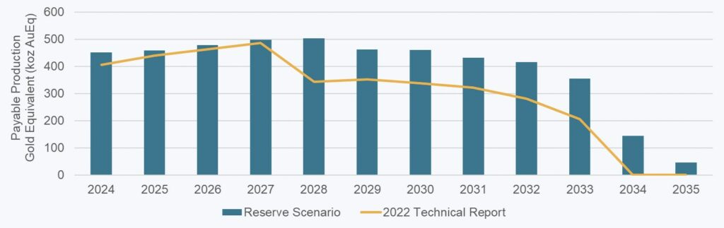 The reserve scenario compares favourably to the production profile outlined in the March 2022 Technical Report (“Technical Report”), which forecast annual payable production to average 375 koz AuEq on an annualized basis through 2033 (adjusted for the same metal prices for Au, Ag, and Cu as year-end 2023 mineral reserves). Annualized AuEq payable production between 2024 and 2033 in the Technical Report was based on annualized production of 257 koz Au, 1,567 koz Ag, and 41.9 Mlb Cu.