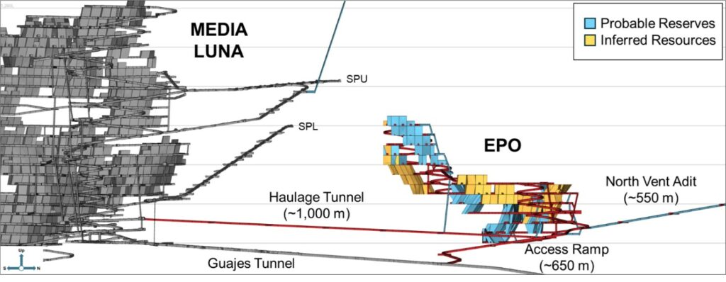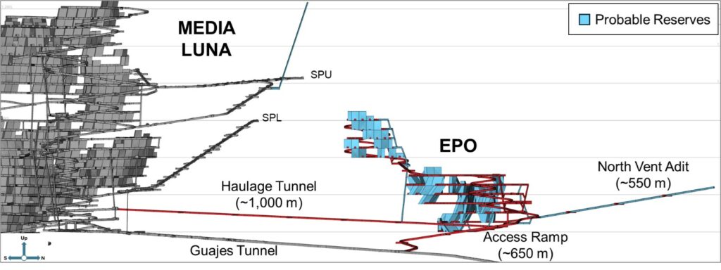 - EPO is a low-risk brownfield addition to the life of mine plan – the close proximity to Media Luna infrastructure requires approximately 2,200 metres (“m”) of upfront lateral development to access EPO and connect to the Media Luna ore handling system (including a 550 m ventilation adit), which facilitates overlapping use of the Media Luna mobile fleet and personnel, and minimizes permitting requirements;