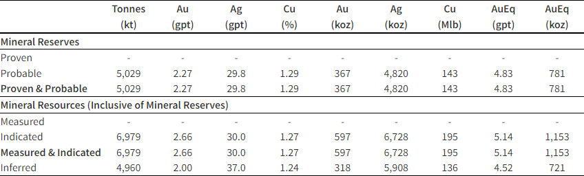 The EPO deposit hosts a Probable Reserve of 5,029 thousand tonnes (“kt”) at an average AuEq grade of 4.83 grams per tonne (“gpt”) for a total of 781 koz AuEq (Table 2). Mineral reserves include 367 koz Au (2.27 gpt), 4,820 koz Ag (29.8 gpt), and 143 Mlb Cu (1.29%). Mineral reserves for EPO are based on year-end 2023 Indicated Resources of 1,153 koz AuEq (6,979 kt at 5.14 gpt AuEq).