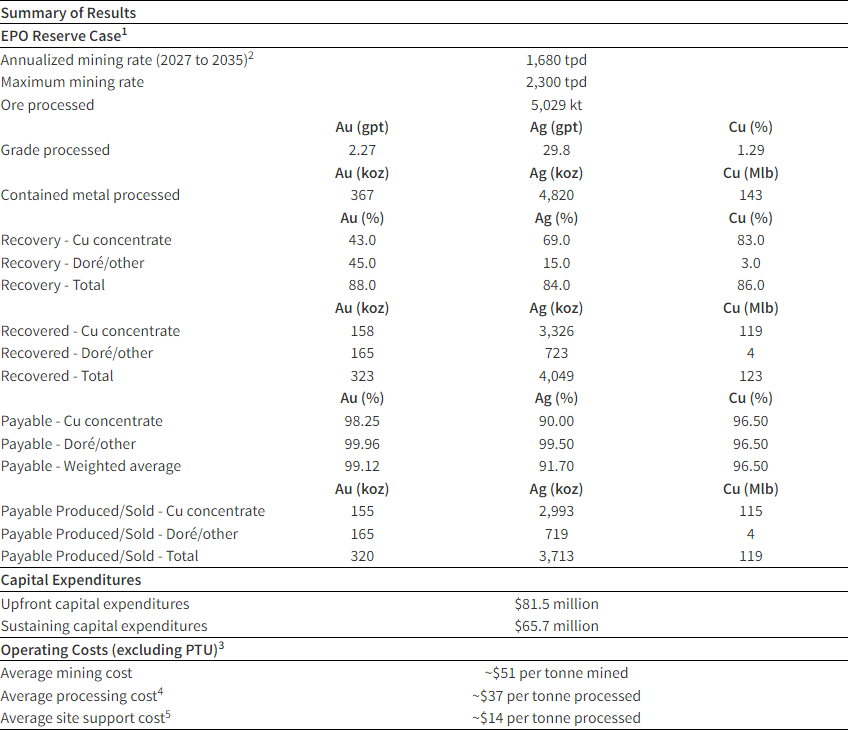 - Metallurgical recoveries at EPO average 87% Au, 85% Ag, and 92% Cu.