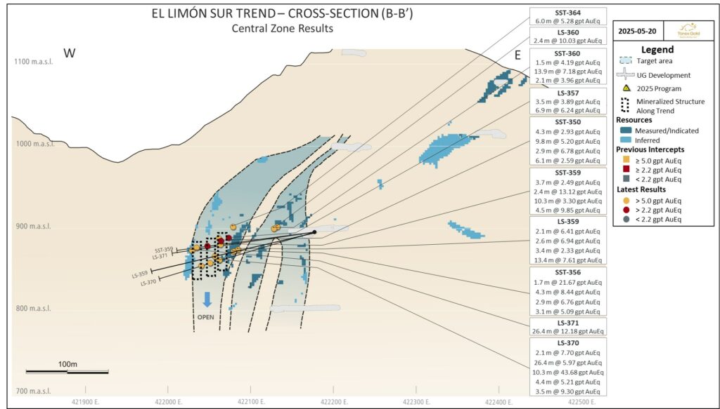 - Central Zone: Holes SST-359 and LS-371 drilled at the intersection of the El Limón Sur Trend and the Z71 fault delivered multiple mineralized intercepts, most notably 12.18 gpt AuEq over 26.4 m at LS-371. Drill holes LS-370 and LS-359 confirmed the continuity of mineralization at depth with multiple high-grade intercepts, most notably 43.68 gpt AuEq over 10.3 m and 5.97 gpt AuEq over 26.4 m in drill hole LS-370. These holes show that mineralization in this area is comprised of at least three vertically continuous parallel mineralized structures along the El Limón Sur Trend that are open along strike and at depth down to 800 metres above sea level (“m.a.s.l.”). A comprehensive follow-up drilling campaign is planned for 2025, aimed to explore the continuity of mineralization along strike, at depth, and to the south (Figures 2A and 2B).