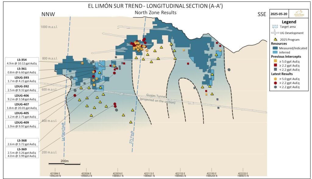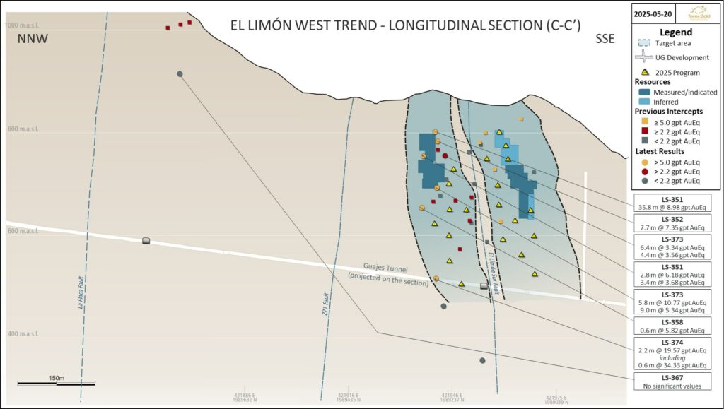 Drilling targeting the expansion of resources along the southern extension of the El Limón West Trend has returned multiple high-grade intercepts. Most notably, drill holes LS-351 (8.98 gpt AuEq over 35.8 m and 6.18 gpt AuEq over 2.8 m), LS-352 (7.35 gpt AuEq over 7.7 m), and LS-373 (10.77 gpt AuEq over 5.8 m) indicate that mineralization is open in all directions. Additionally, drill hole LS-374 (19.57 gpt AuEq over 2.2 m) shows a discrete, high-grade intercept proximal to the elevation of the Guajes Tunnel (~550 m.a.s.l.). This indicates the potential of vertical continuity of mineralization for over 150 m at depth from the base of the current resource. These results warrant follow-up drilling this year aimed to confirm mineralization continuity to the north and south of the El Limón Sur fault and at depth down to the level of the Guajes Tunnel.