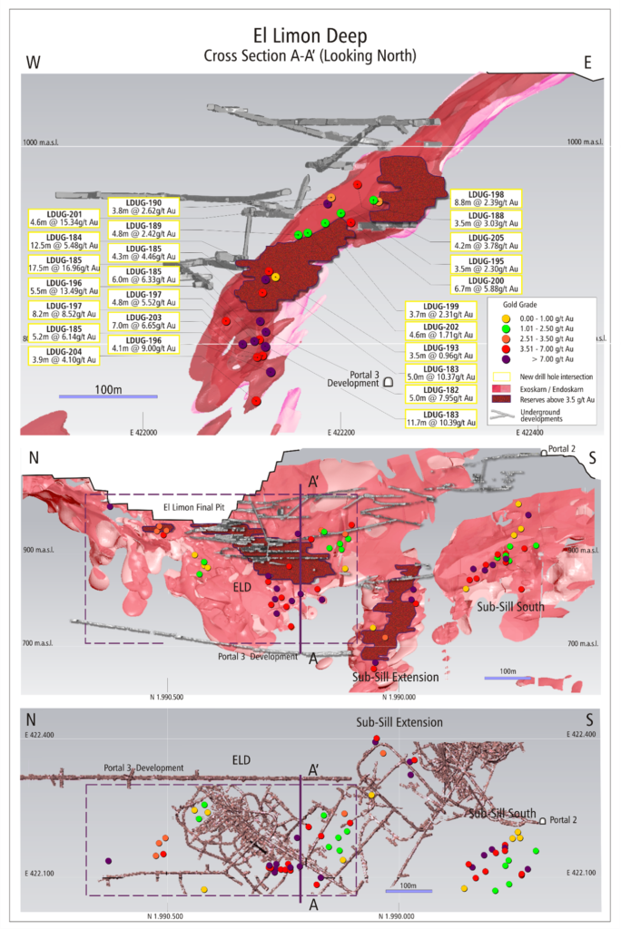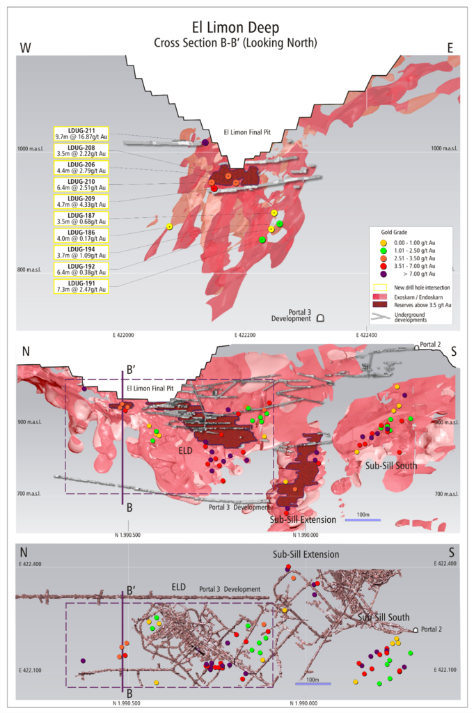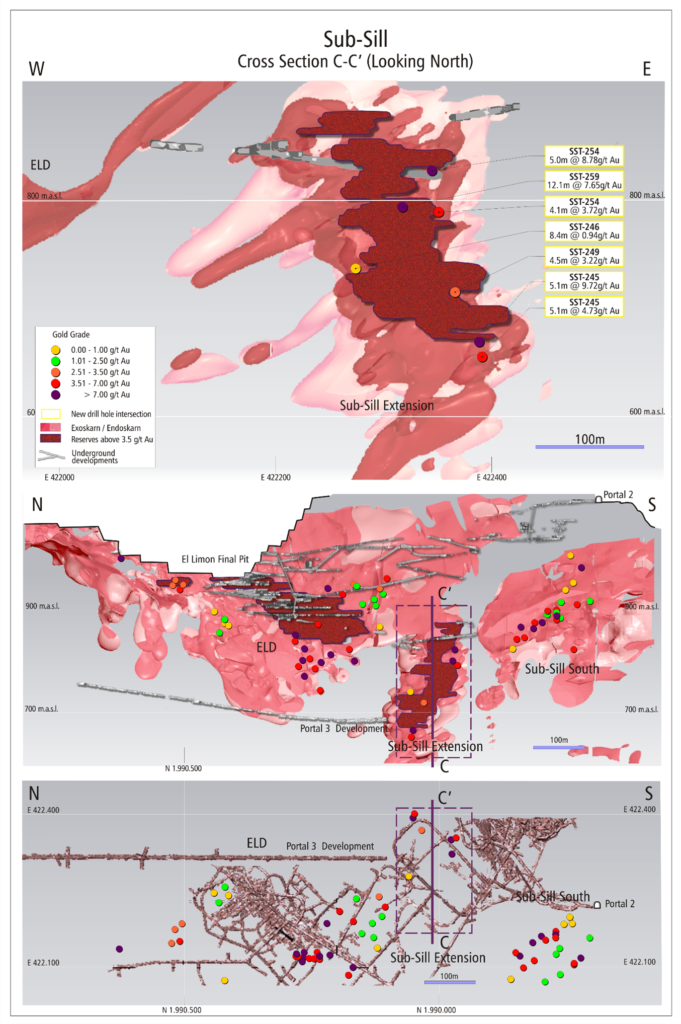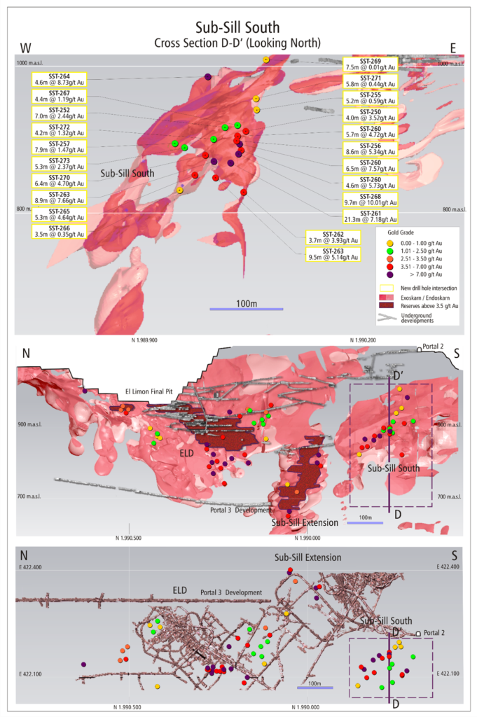 “Step-out and infill drilling at Sub-Sill South has also been positive with several impressive intersects, including 7.18 g/t Au over a core length of 21.3 m, 10.01 g/t Au over 9.7 m and 7.66 g/t Au over 8.9 m. Although further drilling is required, results to date highlight the potential for Sub-Sill South to be developed into a new underground mining front. Sub-Sill South is located 120 m south of the producing Sub-Sill deposit and 470 m north of a zone of mineralization below the El Limón Sur open pit.
