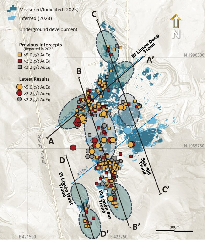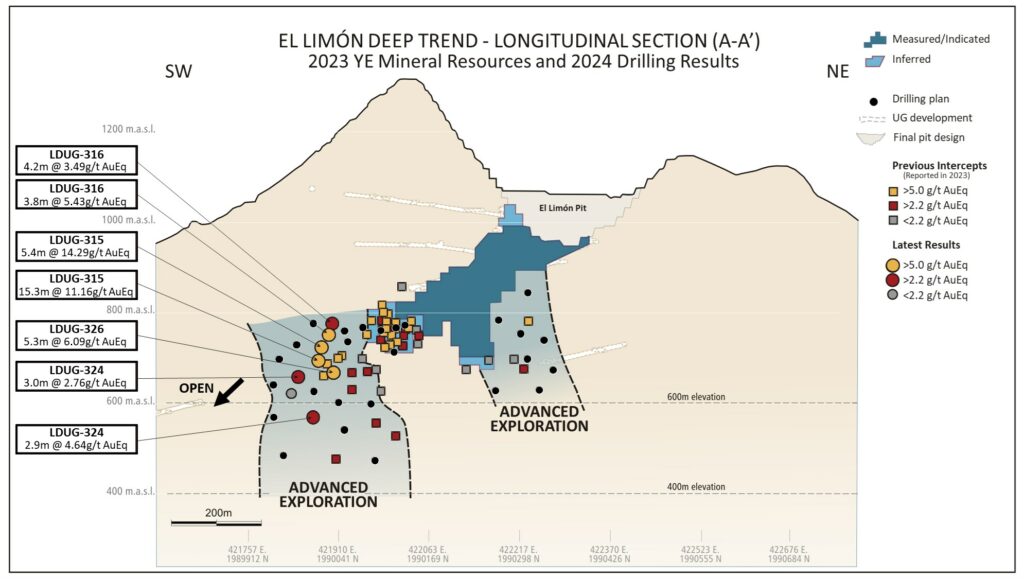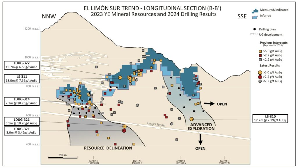 - Drill hole LS-310 of the Advanced Exploration program in the southern ore shoot returned an intercept of 7.19 grams per tonne gold equivalent (“gpt AuEq”) over 12.2 meters (“m”) approximately 100 m below the high-grade intercepts reported in 2023. This indicates that mineralization at the El Limón Sur Trend may extend both to the south and at depth.