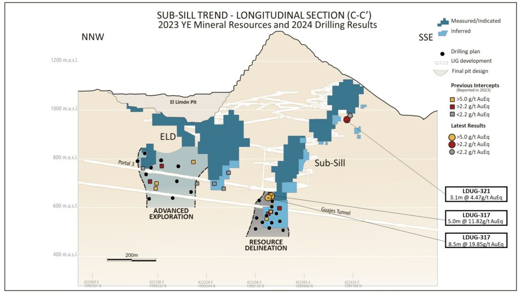As part of the Resource Delineation drilling program at the north ore shoot, drill hole LDUG-314 encountered 10.26 gpt AuEq over 7.68 m, supporting the expected conversion of Inferred Resources to the Indicated category with the year-end 2024 mineral reserve and resource update. Drill hole LDUG-321 confirmed high-grade mineralization down to 500 m.a.s.l. with two notable intercepts (10.70 gpt AuEq over 3.1 m and 3.42 gpt AuEq over 3.0 m).