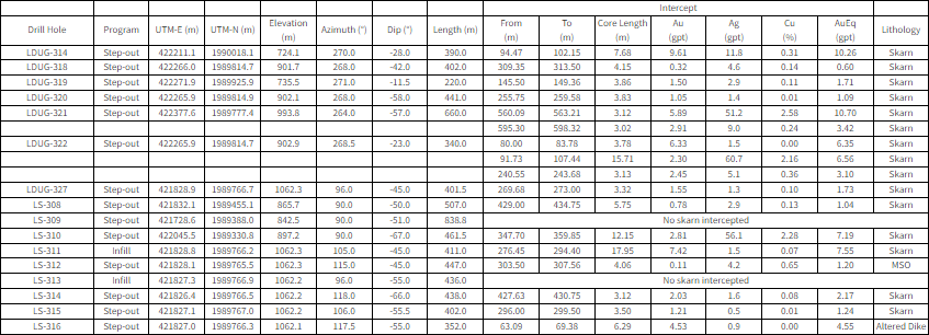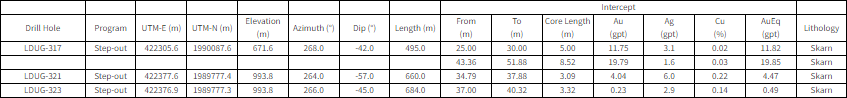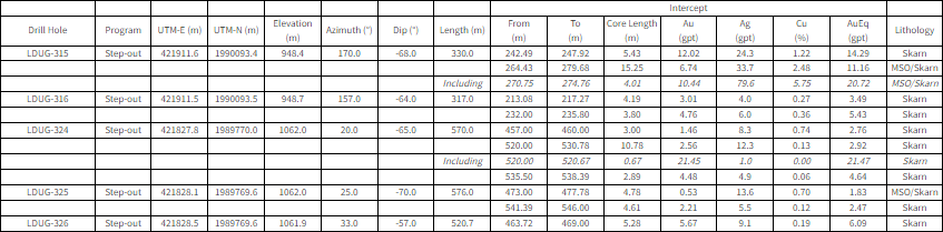 - Drilling as part of the Resource Delineation program in the northern ore shoot has returned high-grade intercepts, confirming the potential to extend Inferred Resources along the 500 m above sea level (“m.a.s.l.”) level. Drill hole LDUG-321 delivered two noteworthy intercepts of 10.70 gpt AuEq over 3.1 m and 3.42 gpt AuEq over 3.0 m.