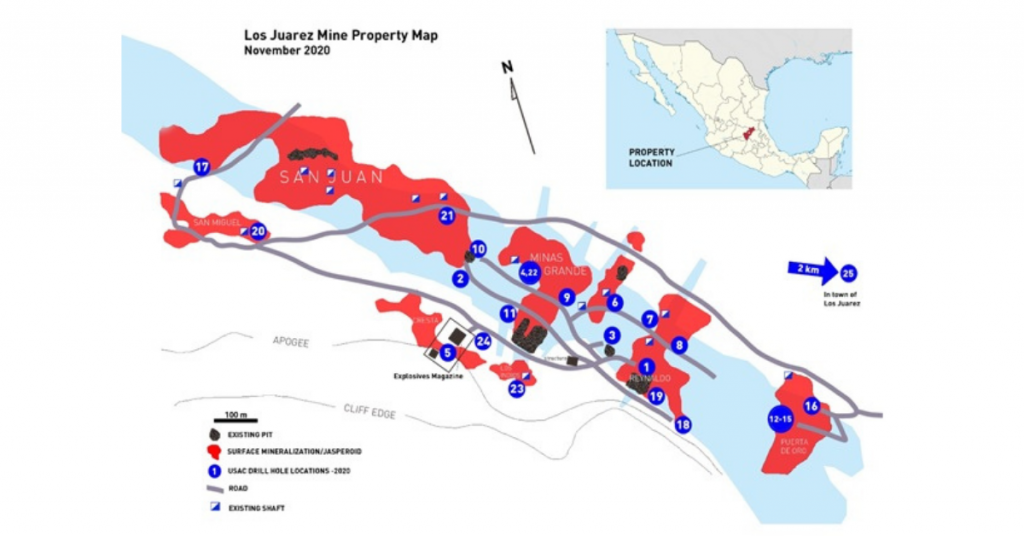 The Los Juarez deposit was originally recognized in 2009 for its antimony potential by the founder of USAC, John Lawrence. Initially, the property was surface sampled for antimony and it was discovered that there were significant gold and silver values associated with the antimony. Since that time, reconnaissance surface sampling and assaying, scattered percussion drilling and assaying, and reconnaissance mapping of the property have been completed.