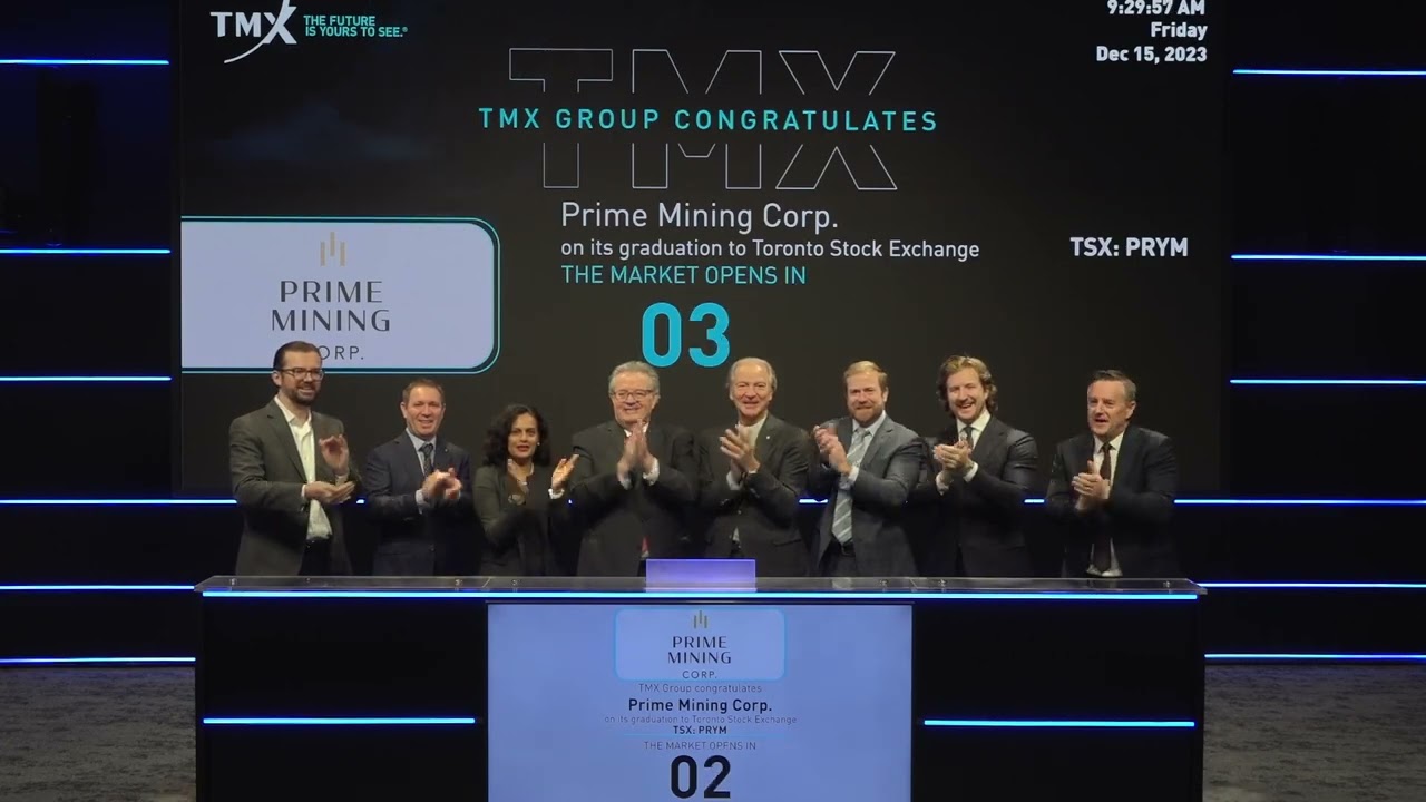 Pierre Lassonde, investor, and Daniel Kunz, Chief Executive Officer and Director, Prime Mining Corp. (“Prime”, or the “Company”) (TSX: PRYM), along with Scott Hicks, Executive Vice President, Prime, investors and senior Prime team members joined Robert Peterman, Chief Commercial Officer, Toronto Stock Exchange (TSX), to open the market and celebrate the Company’s graduation to Toronto Stock Exchange.