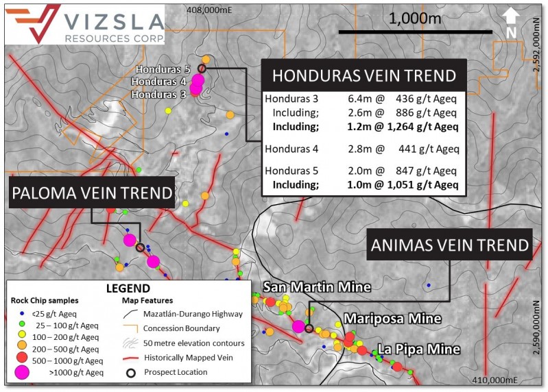 VANCOUVER, Feb. 4, 2020 /CNW/ – Vizsla Resources Corp. (TSX-V: VZLA) (“Vizsla” or the “Company“) is pleased to announce further surface sampling results from exploration in the Panuco silver-gold district in Mexico. Recent surface sampling of the new Honduras vein has returned high grades above minor historical workings over a 250-metre strike length. The vein trends northerly beneath younger cover rocks concealing its true length. The results make this an attractive target for the current 14,500 metre drilling program in progress.