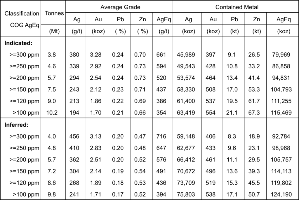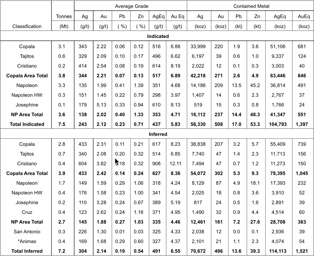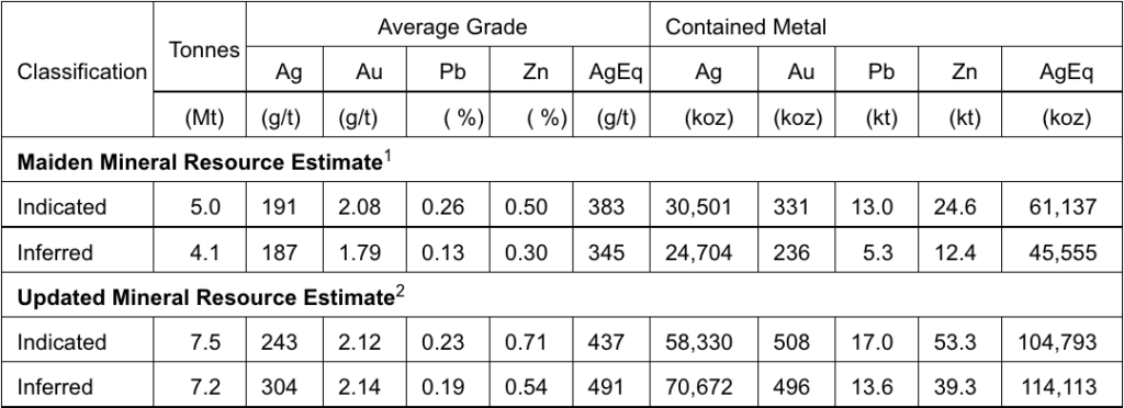 Indicated Mineral Resources are estimated at 7.5 million tonnes (“Mt”) grading 243 grams per tonne (“g/t”) silver, 2.12 g/t gold, 0.23% lead, and 0.71% zinc (437 g/t silver equivalent (“AgEq”)). The Updated Mineral Resource Estimate includes indicated mineral resources of 58.3 million ounces (“Moz”) of silver, 508 thousand ounces (“koz”) of gold, 17.0 kilo tonnes (“kt”) of lead, and 53.3 kt of zinc (104.8 Moz AgEq).