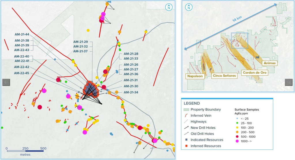 - Cuevillas: AM-22-42 returned 1,088 grams per tonne (g/t) silver equivalent (AgEq) over 1.26 metres true width (mTW) (787 g/t silver, 3.65 g/t gold, 0.09 % lead and 0.19 % zinc)