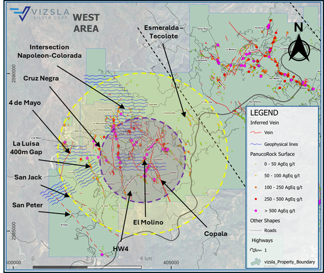 - Colorada-Napoleon intersection is a conceptual target located at the projected intersection of the Copala fault and the northern extent of Napoleon, where geologic conditions suggests good structural preparation within in favorable host rock. This is further supported by preliminary AI and Machine Learning analysis completed by VRIFY. Additionally, the recently completed, frequency-domain ground HLEM geophysical survey has revealed multiple conductor anomalies. Some of these anomalies that deviate from trends coincide with mapped vein traces or vein projections. Vizsla Silver’s team is analyzing the geophysical data to plan additional exploratory drilling in this area.