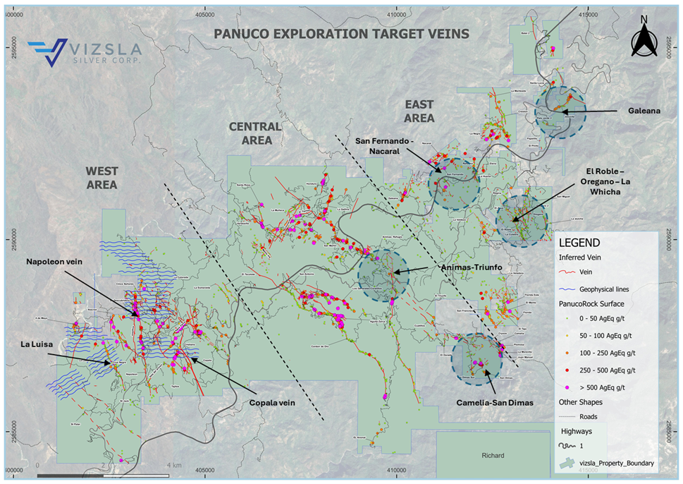 Since consolidation of the Panuco district, Vizsla Silver has continuously conducted detailed geologic mapping and rock chip sampling to identify additional mineralized centers. To date Vizsla Silver has mapped 68% of the district at a 1:1,000 scale and has collected over 5,000 rock chip samples. The mapping and sampling efforts, supported by a LiDAR survey conducted in 2023, have allowed the Company to define over 158 targets in the district, of which 43 have been drill tested. With the recent integration of Terraspec data, WorldView-III, and ASTER satellite imagery, the Company is enhancing its ability to prioritize and rank these exploration targets. An example of this is the most recent discovery of high-grade mineralization along the Animas vein system at the La Pipa target where hole AM-25-90 intercepted 653 g/t silver, 4.26 g/t gold, 0.02 % lead and 0.04 % zinc (897 g/t AgEq) over 5.80 metres true width (mTW) and 457 g/t silver, 2.00 g/t gold, 0.08 % lead and 0.18 % zinc (568 g/t AgEq) over 2.60 mTW (see News Release from March 31, 2025).