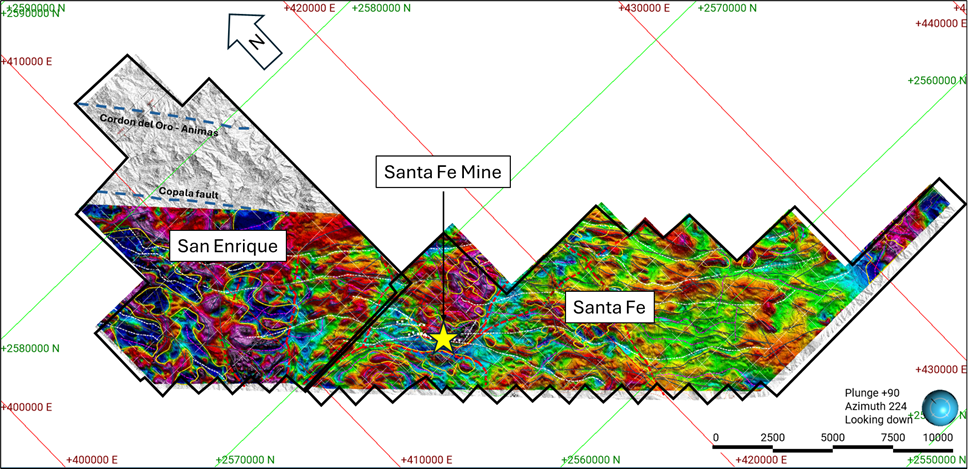 The San Enrique prospect area comprises two titled mining claims covering 10,667 Ha between Panuco and Santa Fé projects in the emerging silver-gold-rich Panuco – San Dimas corridor. LiDAR and airborne magnetic surveys in the area show strong NW-trending lineaments, indicative of regional faults and fractures. Two of these lineaments are aligned and seem to be the SE extensions of the Copala fault and the Cordon del Oro – Animas vein structures in Panuco (see Figure 5). Several factors highlight the strong prospectivity of the San Enrique area. These include its strategic location within the Panuco to San Dimas corridor, proximity to high grade deposits immediately to the north with a measured and indicated mineral resource of 222.4 million ounces silver equivalent and an inferred resource of 138.7 million ounces silver equivalent (refer to Vizsla Silver’s press release dated January 6, 2025), structural extensions of the Copala fault and the Cordon to Animas lineament, the presence of multiple domes, and the Santa Fé mine along with six additional vein prospects located directly to the south along a separate northwest trending regional fault.