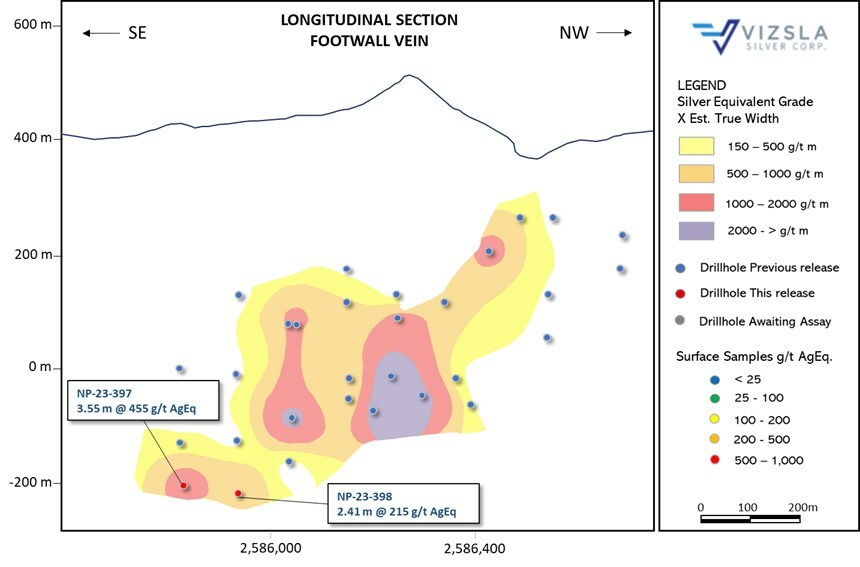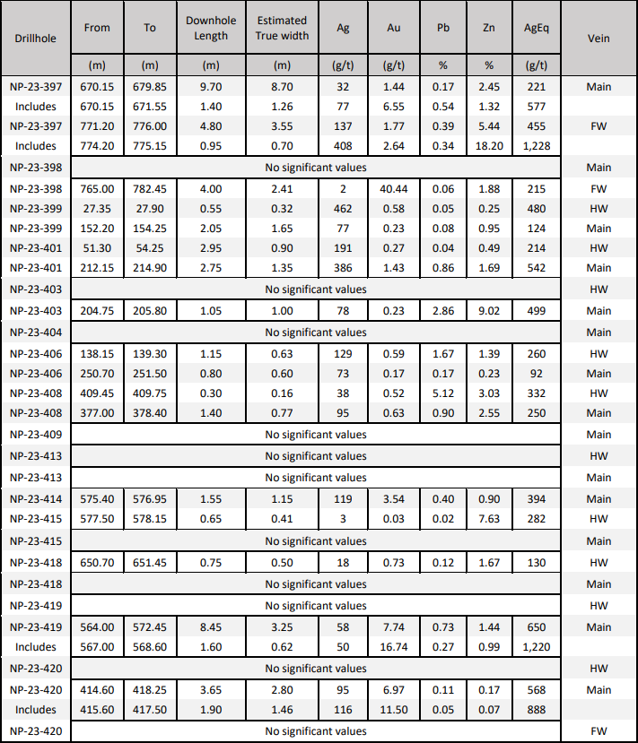 - NP-23-397 returned 455 g/t AgEq over 3.55 mTW (137 g/t silver, 1.77 g/t gold, 0.39 % lead and 5.44 % zinc)