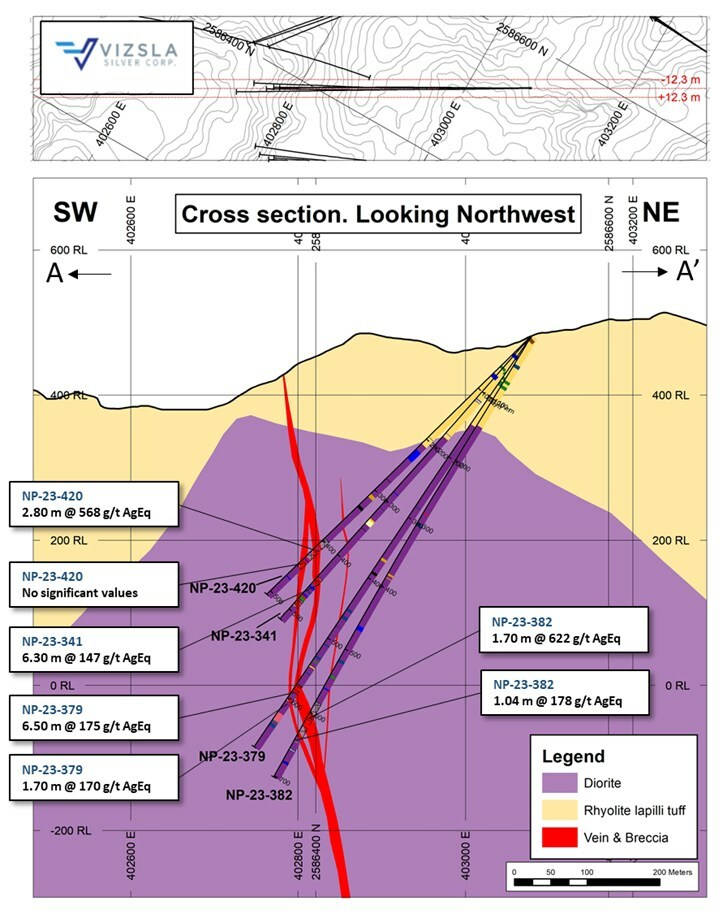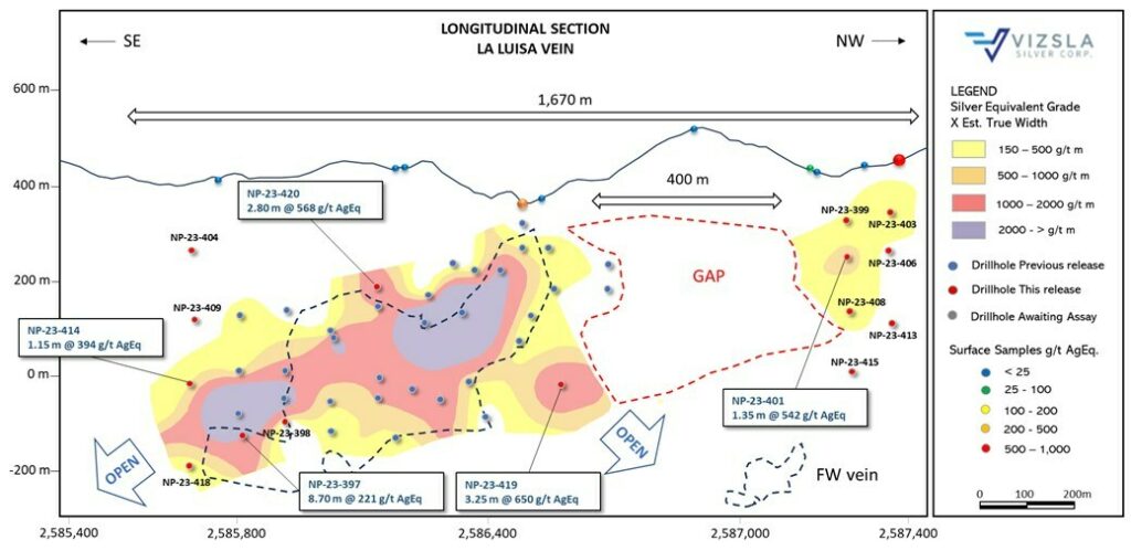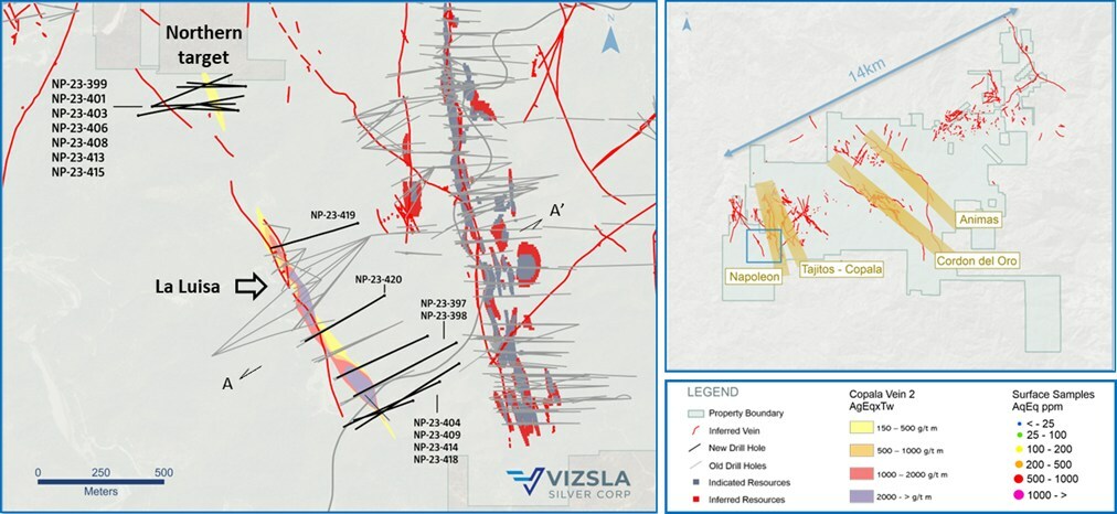 VANCOUVER, BC, Dec. 14, 2023 /CNW/ – Vizsla Silver Corp. (TSXV: VZLA) (NYSE: VZLA) (Frankfurt: 0G3) (“Vizsla Silver” or the “Company“) is pleased to report results from 15 new drillholes targeting the “La Luisa” Vein located ~700 metres west of the Napoleon Area resource, at its 100%-owned flagship Panuco silver-gold project (“Panuco”) in Mexico. Recently completed shallow drilling has confirmed the northern continuation of the Luisa structure, expanding its potential strike-length to 1,670 metres.