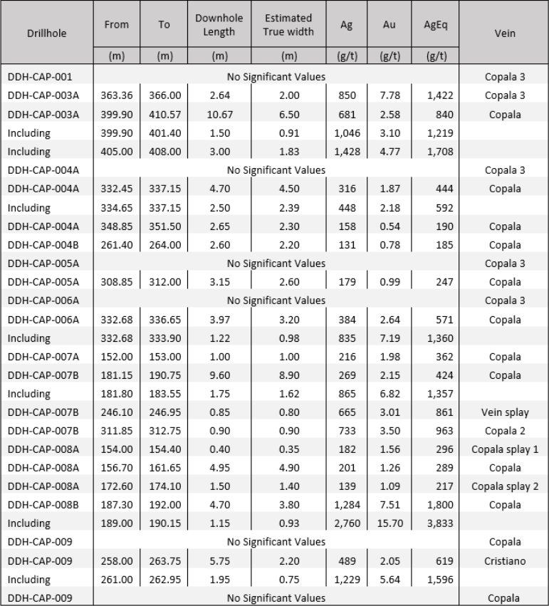 • DDH-CAP-007B returned 424 grams per tonne (g/t) silver equivalent (AgEq) over 8.90 metres true width (mTW) (269 g/t silver and 2.15 g/t gold)