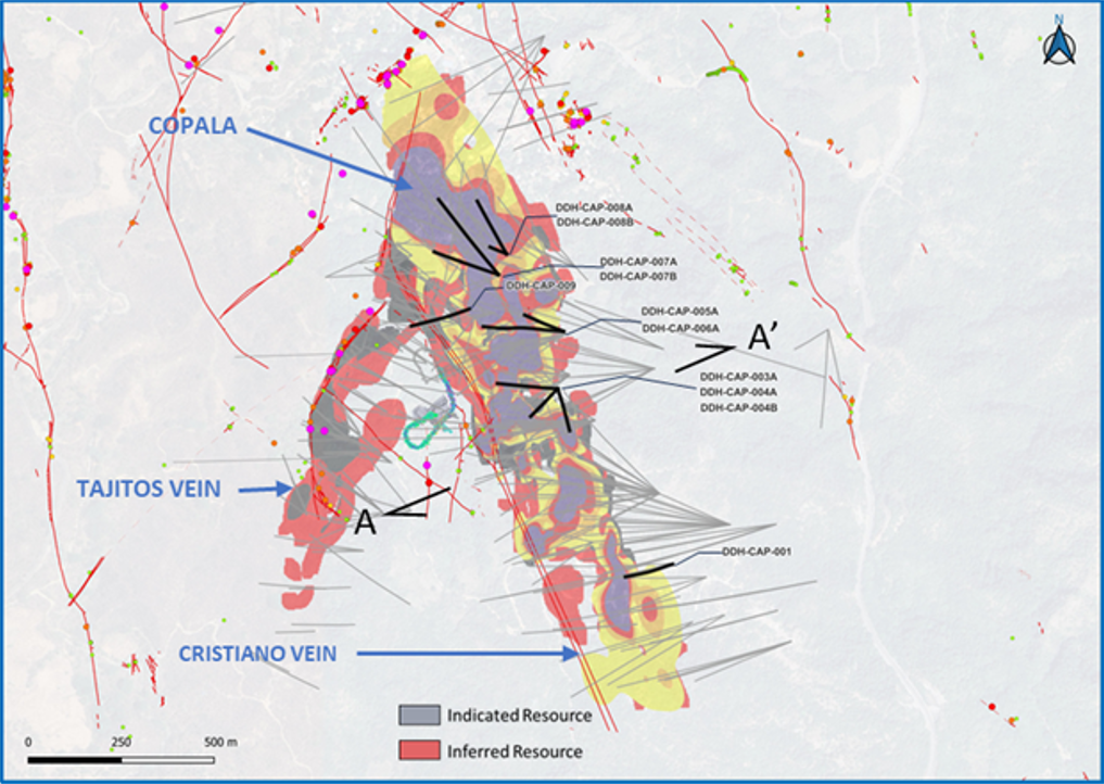 • DDH-CAP-003A returned 1,422 grams per tonne (g/t) silver equivalent (AgEq) over 2.00 metres true width (mTW) (850 g/t silver and 7.78 g/t gold)
