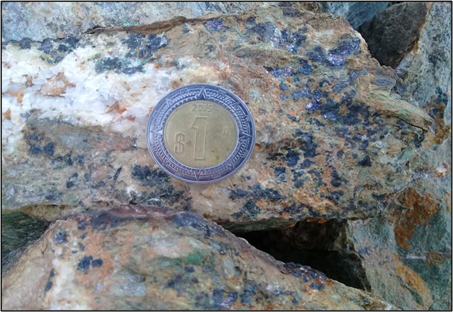 Copper-gold mineralization contained within the Zaachila project area has been interpreted to represent the oxidized portions of volcanogenic massive sulfide deposits (VMS), a genetic class of mineral deposits. VMS deposits are strata-bound accumulations of sulfide minerals that precipitated at or near the sea floor in spatial, temporal and genetic association with contemporaneous mineralization (Franklin, et al, 2005). The Santa Marta VMS deposit (Minaurum Gold Corp.), located in Eastern Oaxaca and about 150 km east of the Riqueza Marina – Zaachila concessions, shares many similarities to the VMS occurrences observed in the Zaachila project area. Similar geologic settings with probable VMS deposits in Cretaceous rocks have been identified in Mexico at two major districts: Campo Morado (Guerrero) and San Nicolas (Zacatecas).
