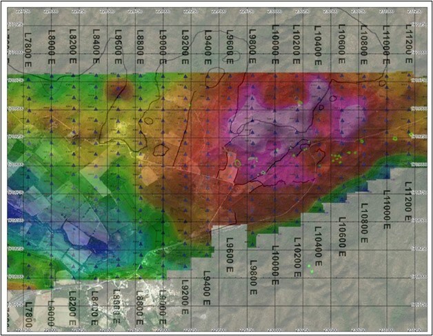 A combination of gravity and magnetics were employed over the Zaachila block and collectively reveal a ~1.5 x 1 km gravity anomaly centered adjacent to the most persistent and extensive surface shows of Copper mineralization (Figure 4) and a pronounced ~3 km linear magnetic low centered directly beneath this extensive surface Copper mineralization (Figure 5). The mag anomaly is likely related to magnetite destruction in the presence of high hydrothermal fluid flows. The gravity anomaly may be related to VMS sulfide horizons and/or to the more mafic margins of the trondhjemite complex.