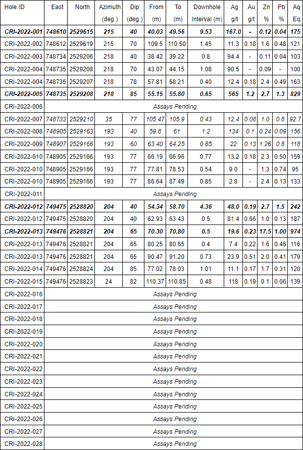Hole CRI-2002-013 encountered significant base metals resulting in 0.5 meters @ 974 g/t Ag Eq (19.6 g/t Ag, 0.23 g/t Au, 17.5% Zn, 1% Pb) from 70.3 m downhole. Also base metal rich, hole CRI-2022-12 resulted in 4.36 meters @ 242 g/t Ag Eq (48 g/t Ag, 0.19 g/t Au, 2.7% Zn and 1.5% Pb) from 54.34 m downhole.